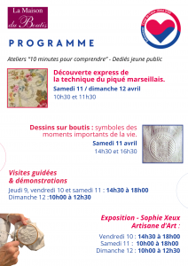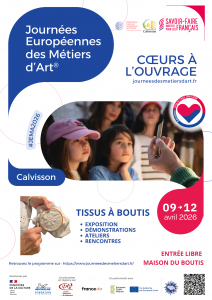 La Commune de Calvisson organise les Journées Européennes des Métiers d’Art, a cette occasion le Musée du Boutis ouvrira ses portes le jeudi 9 avril de 14h30 à 18h, Vendredi 10 avril de 14h30 à 18h, Samedi 11 avril de 10h à 18h, Dimanche 12 avril de 10h à 12h30, avec démonstrations de la broderie au Boutis et à partir du vendredi démonstrations du Piqué Marseillais par Sophie XEUX, Artisane d’Art. Voir programme ci-joint.